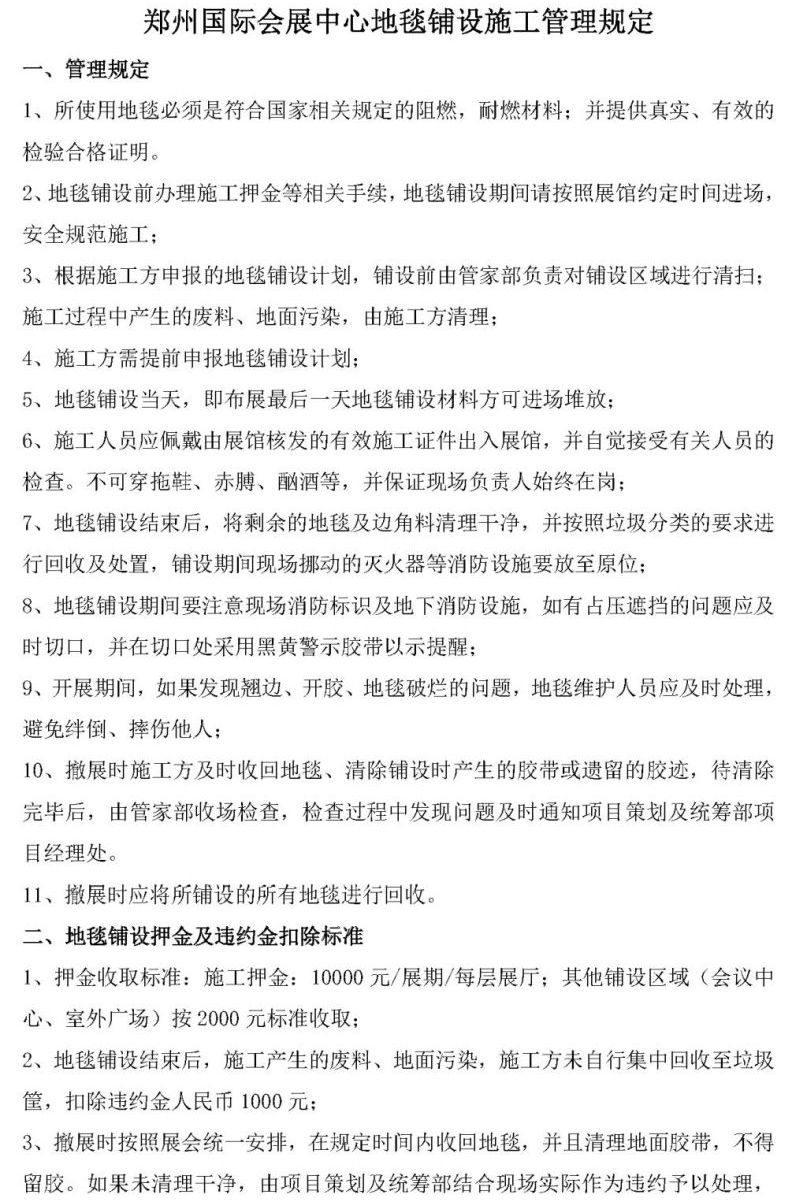 首頁服務(wù)指南下載中心文章詳情 文章詳情 地毯鋪設(shè)施工管理規(guī)定 鄭州國(guó)際會(huì)展中心地毯鋪設(shè)施工管理規(guī)定 《鄭州國(guó)際會(huì)展中心地毯鋪設(shè)施工管理規(guī)定》文檔下載