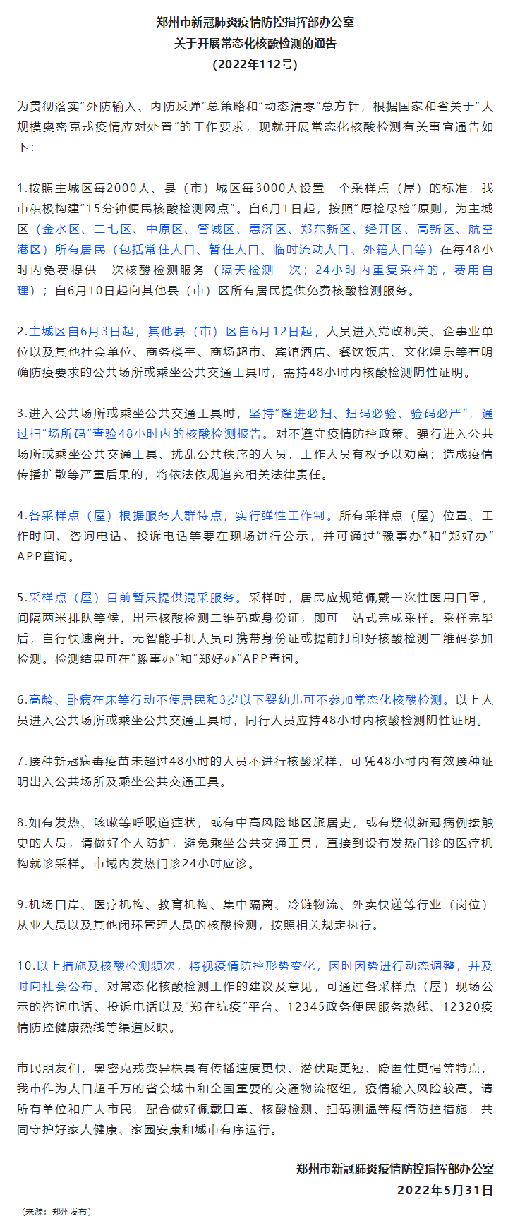 【轉(zhuǎn)載】鄭州市新冠肺炎疫情防控指揮部辦公室關(guān)于開(kāi)展常態(tài)化核酸檢測(cè)的通告