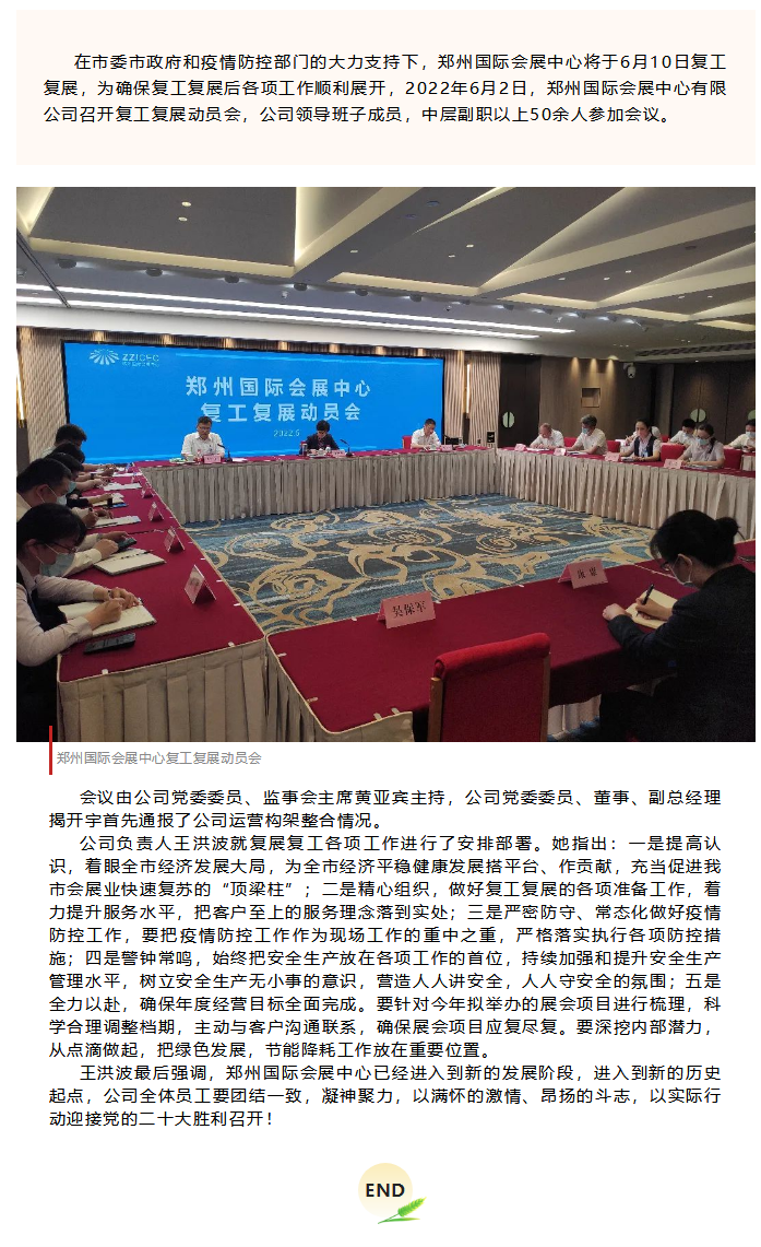 首頁(yè)新聞中心展會(huì)新聞文章詳情 文章詳情 昂揚(yáng)斗志、多措并舉,積極做好會(huì)展中心復(fù)工復(fù)展工作 在市委市政府和疫情防控部門的大力支持下,鄭州國(guó)際會(huì)展中心將于6月10日復(fù)工復(fù)展,為確保復(fù)工復(fù)展后各項(xiàng)工作順利展開,2022年6月2日,鄭州國(guó)際會(huì)展中心有限公司召開復(fù)工復(fù)展動(dòng)員會(huì),公司領(lǐng)導(dǎo)班子成員,中層副職以上50余人參加會(huì)議。