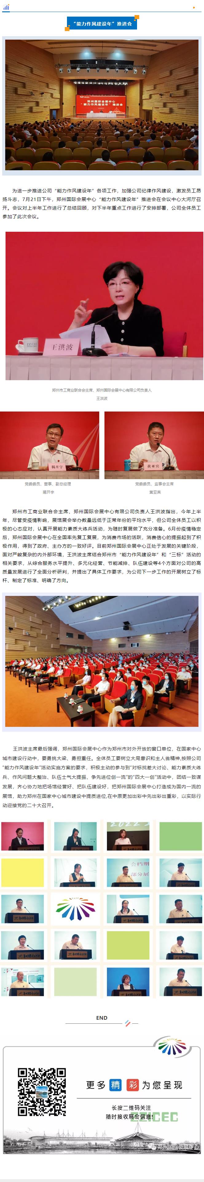 首頁新聞中心展會新聞文章詳情 文章詳情 鄭州國際會展中心有限公司召開“能力作風建設年”推進會 為進一步推進公司“能力作風建設年”各項工作,加強公司紀律作風建設,激發(fā)員工昂揚斗志,7月21日下午,鄭州國際會展中心“能力作風建設年”推進會在會議中心大河廳召開。會議對上半年工作進行了總結回顧,對下半年重點工作進行了安排部署,公司全體員工參加了此次會議。
