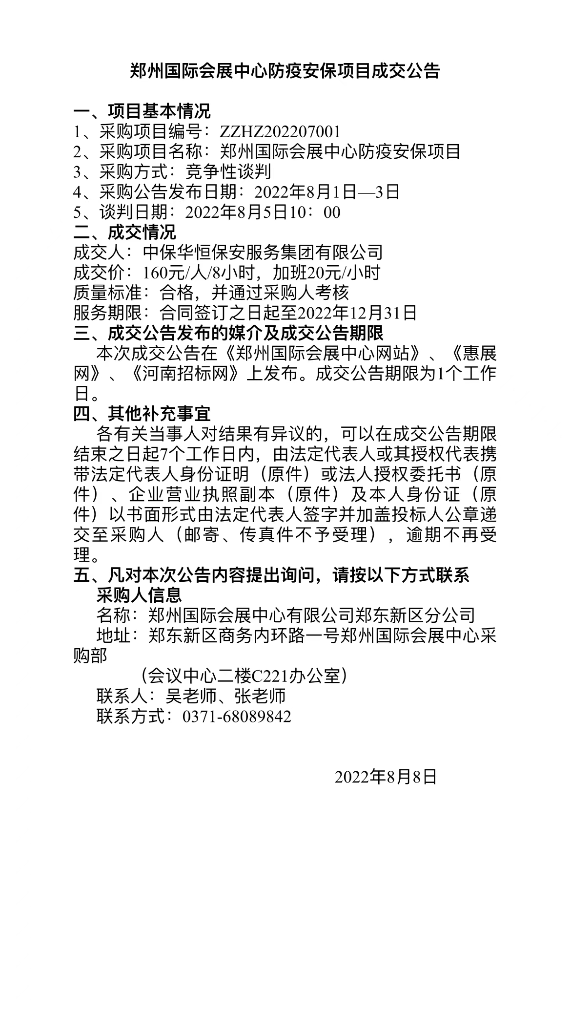 鄭州國際會展中心防疫安保項目成交公告
