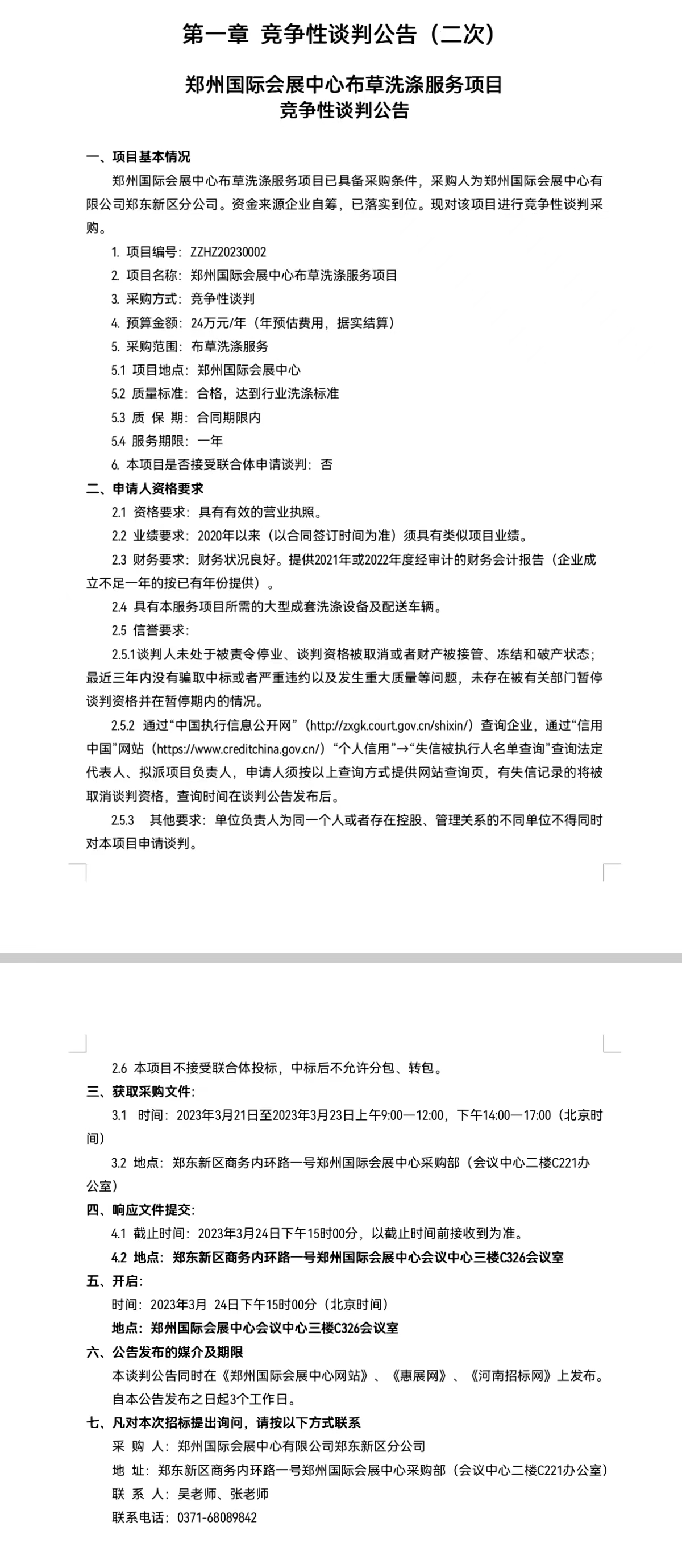 鄭州國際會(huì)展中心布草洗滌服務(wù)項(xiàng)目 競(jìng)爭性談判公告(二次)